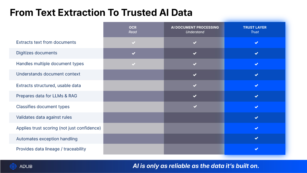 A trust layer goes beyond extraction. It ensures that every document is: